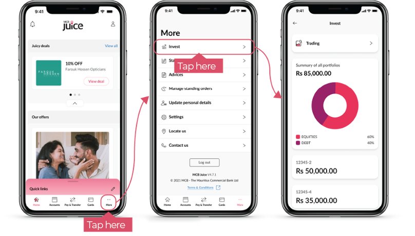 This service is not currently available on MCB Juice. Please contact your dedicated banker to learn more about your investment options and how to open an investment account with MCB.