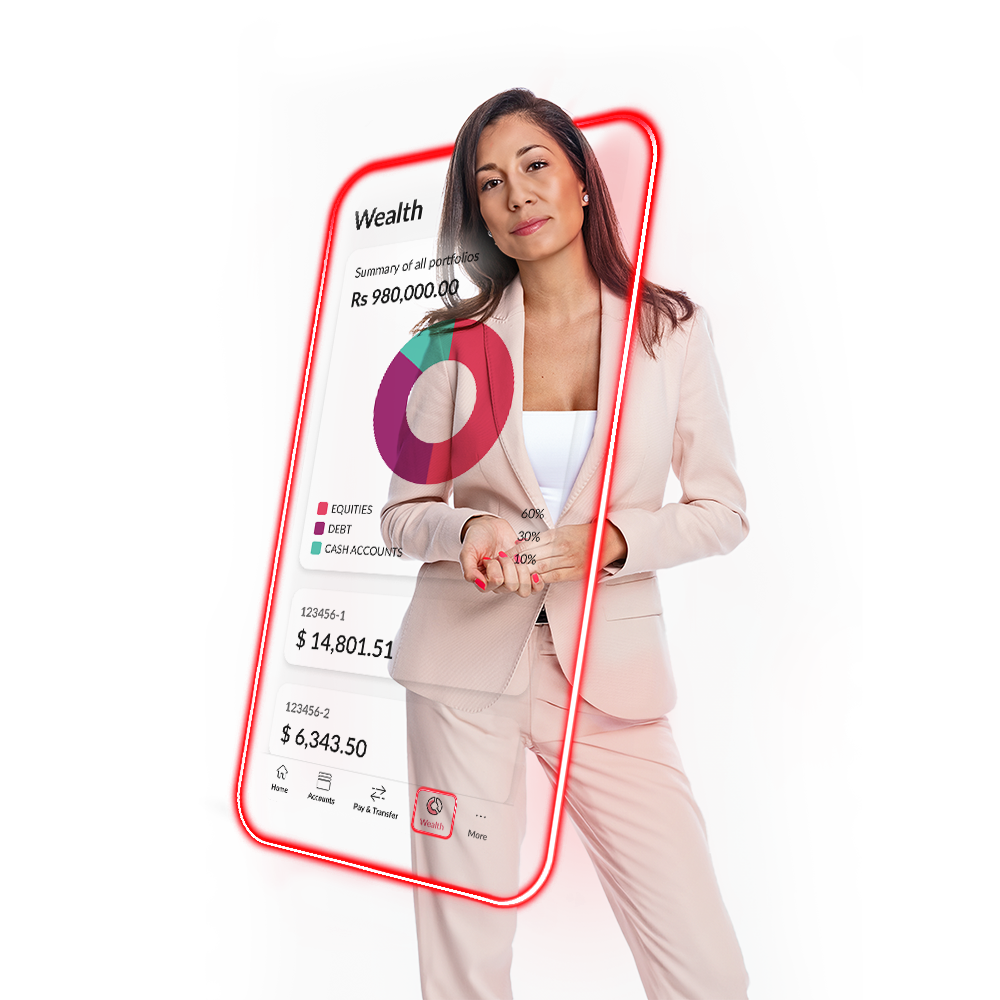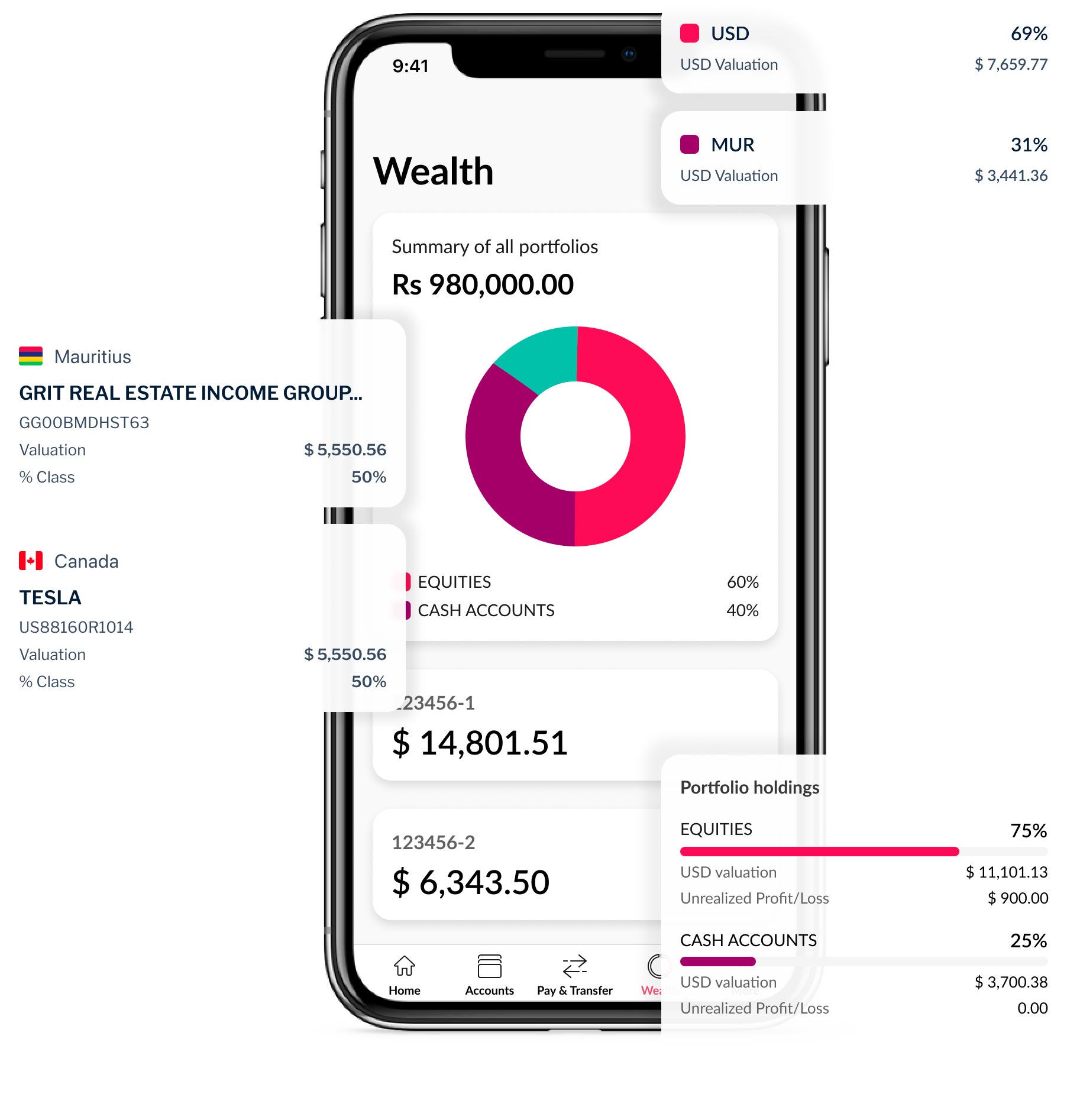 • Debt • Equities • Mutual Funds • Commodities • Alternatives • Derivatives | • Cash Accounts • FX Deals • MCB Deposits • MCB Money Market • Deposit with other institutions |